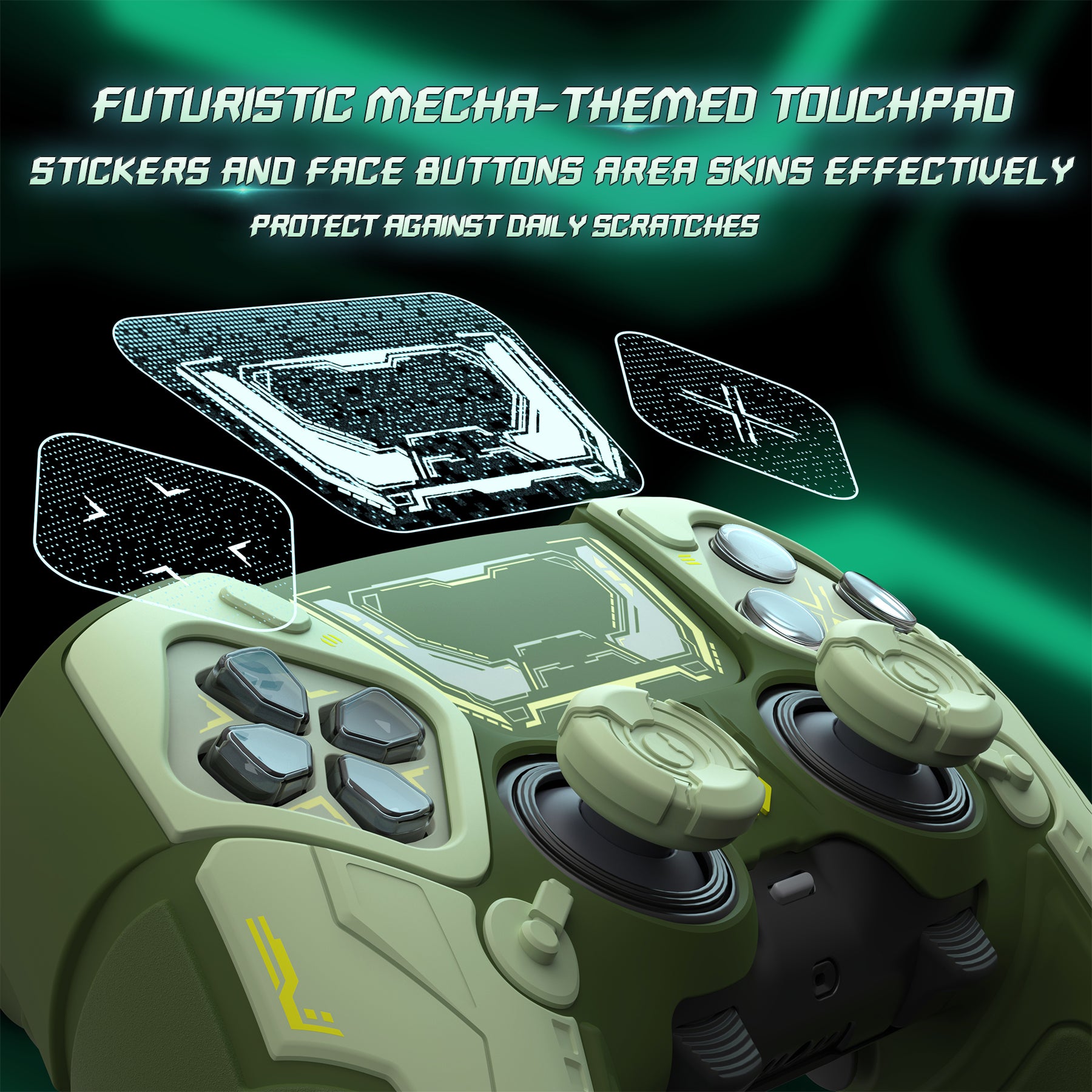 3. メカスタイルのデザインは、シャープなアーマーラインと幾何学パネルを採用。背面、ABXYボタン、タッチパッド、充電ポート部分に対応したシリコンカバー、サムグリップ、ステッカーをセットにすることで、統一感のあるメカ風コントローラーに仕上げます。