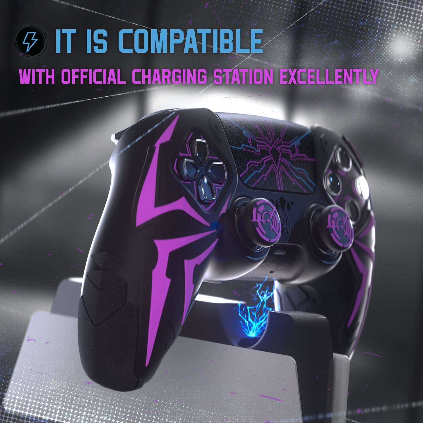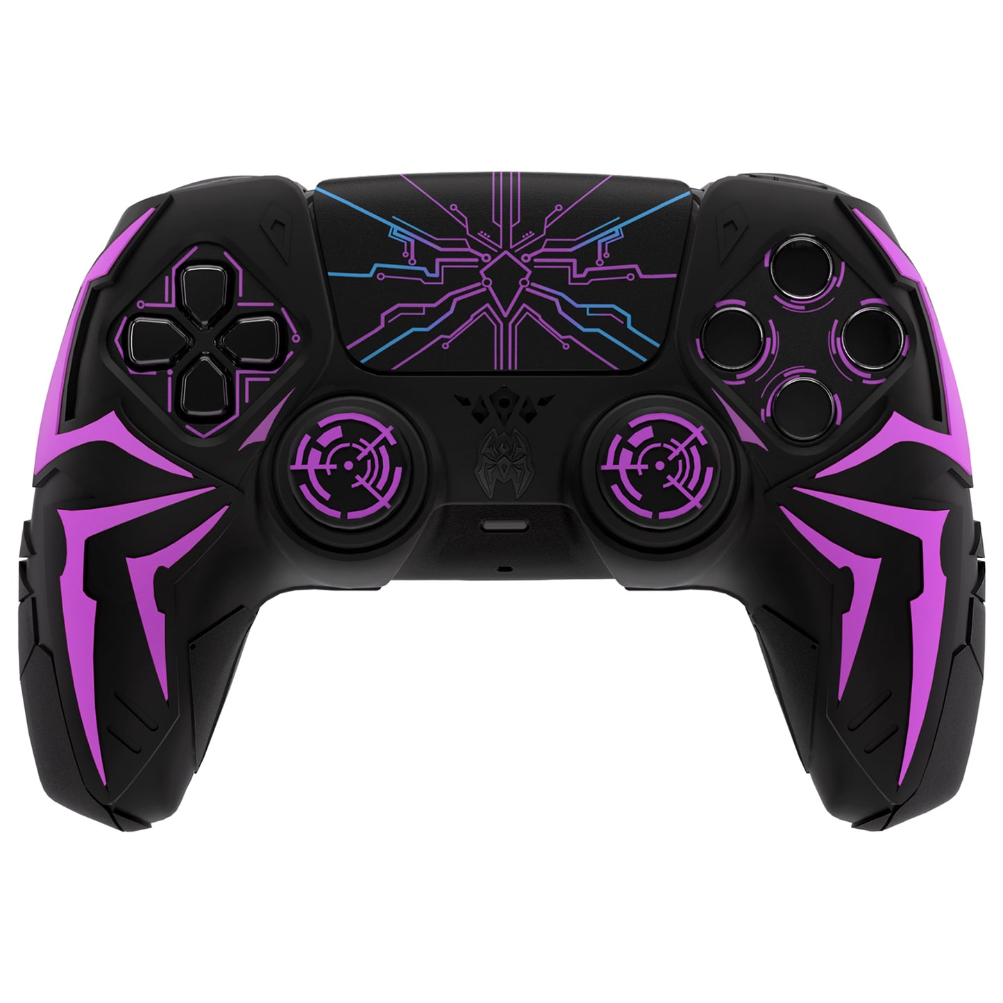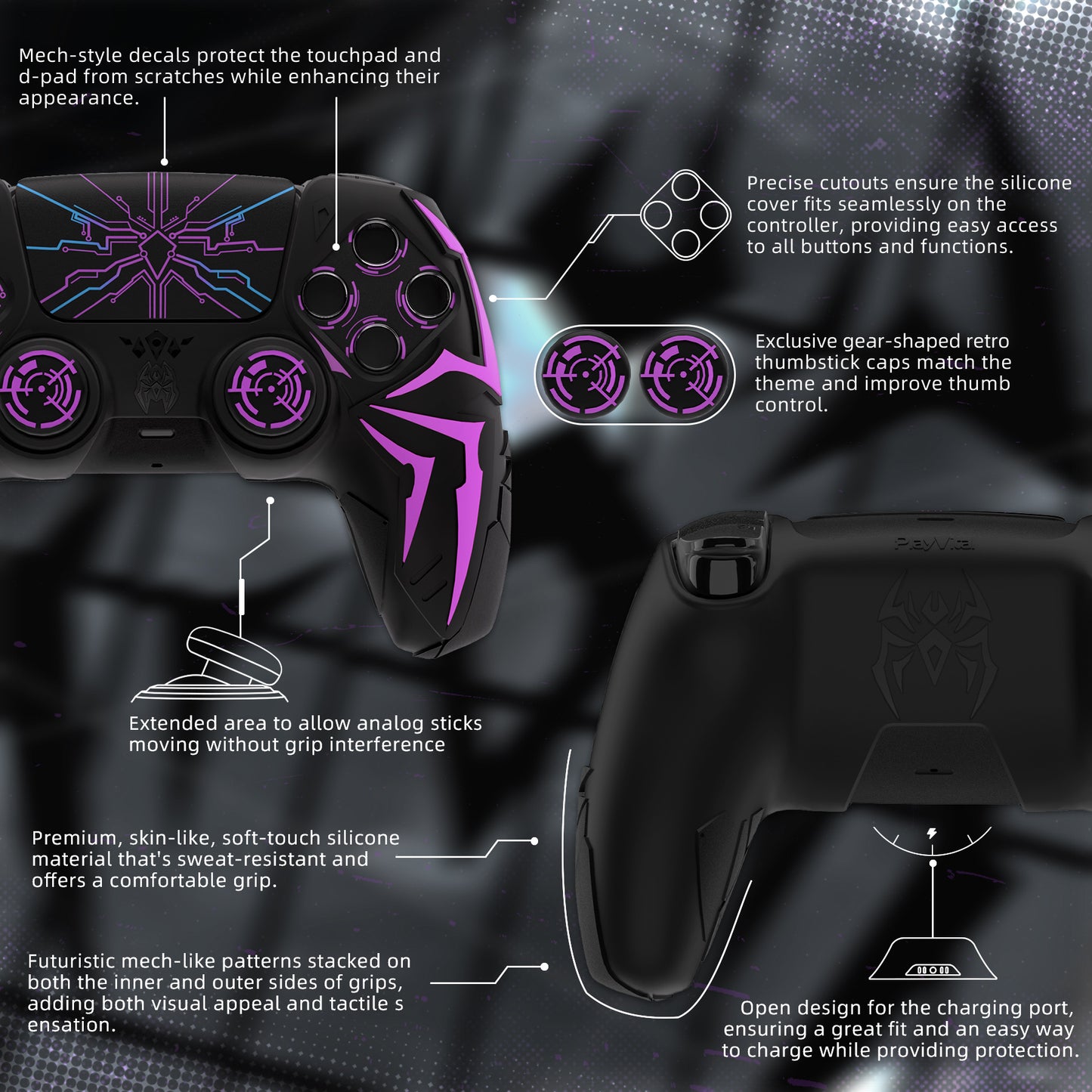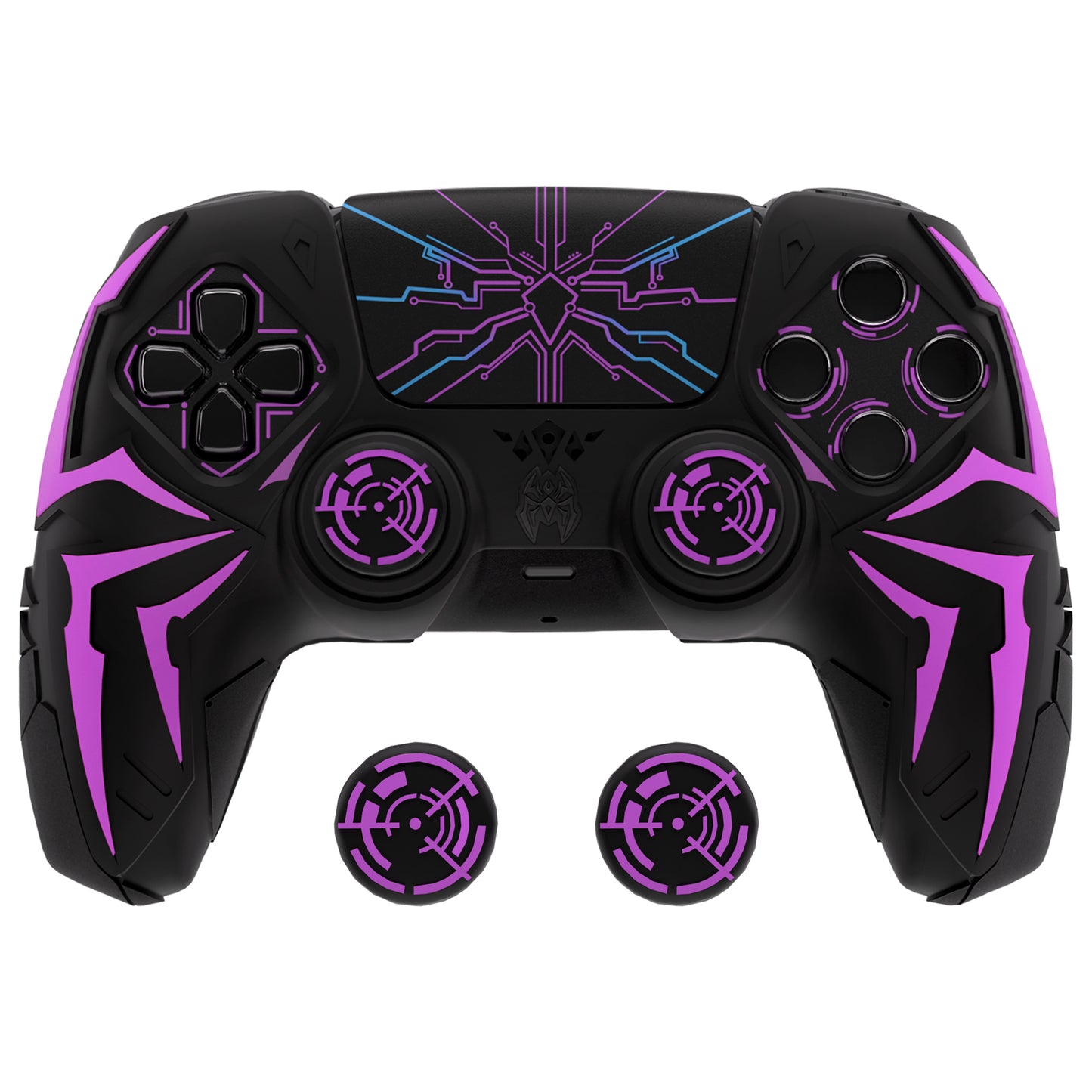 PlayVital ps5コントローラー対応用サイバースパイダーデザインシリコン保護カバー、サムグリップキャップ2個やステッカー6枚付属、充電ドック対応【ブラック&パープル】