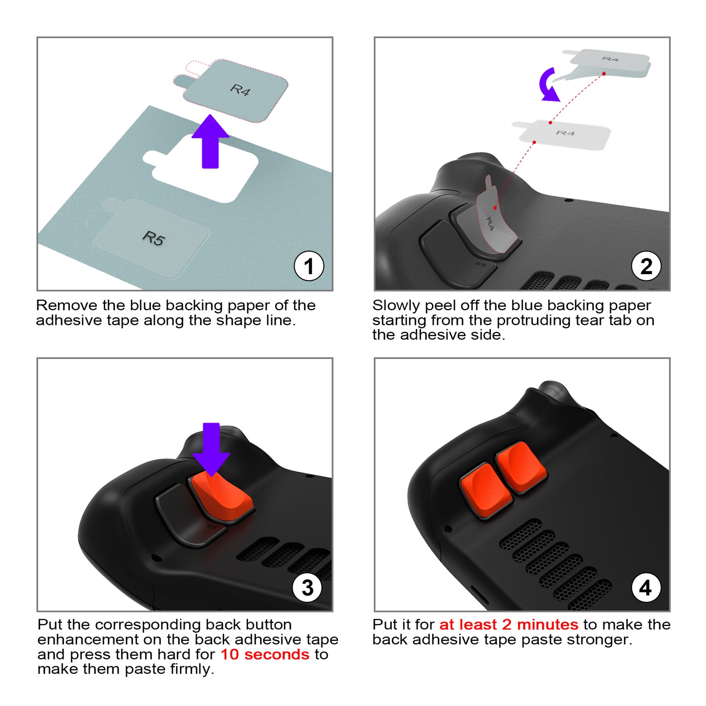 4. 詳しい取り付け方法は、付属のマニュアル または YouTubeで「PlayVital Ergonomic Back Button Enhancement Set for Steam Deck LCD & OLED」 と検索してご覧ください。