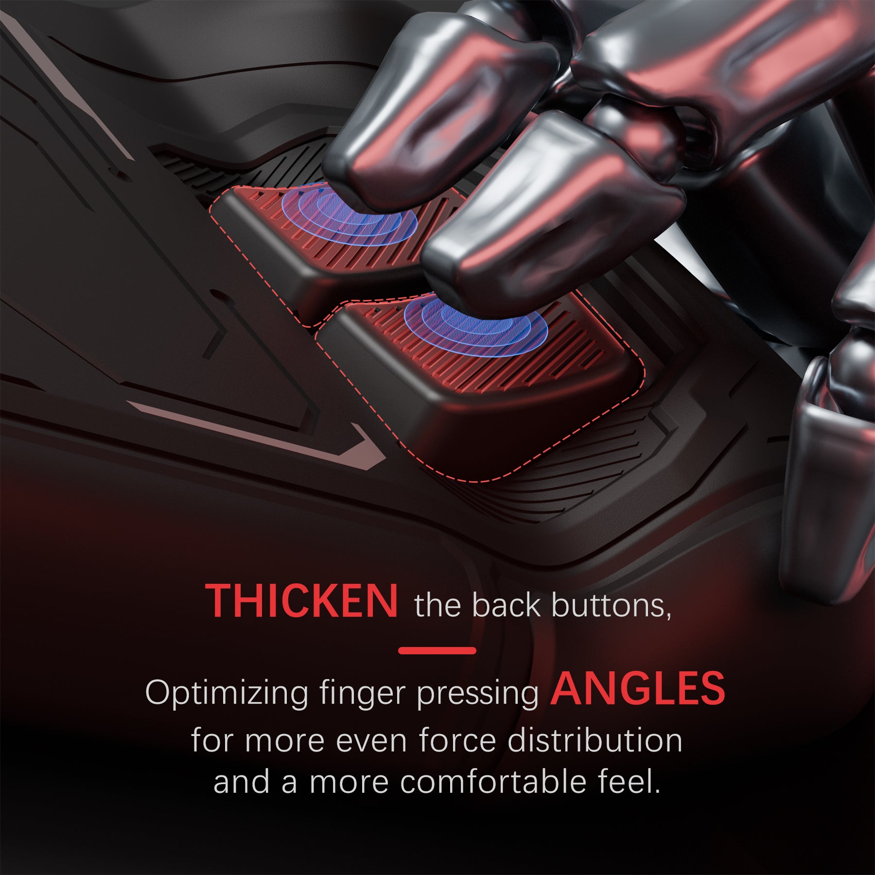4. 完全なテーマセットには、シリコンカバー、メカ風スティックキャップ、ABXYボタン・方向キー・タッチパッド用ステッカー、さらに押し心地を強化し反応性を高める交換用バックボタンが付属。統一感のあるメカ風デザインでセットアップを完成させます。