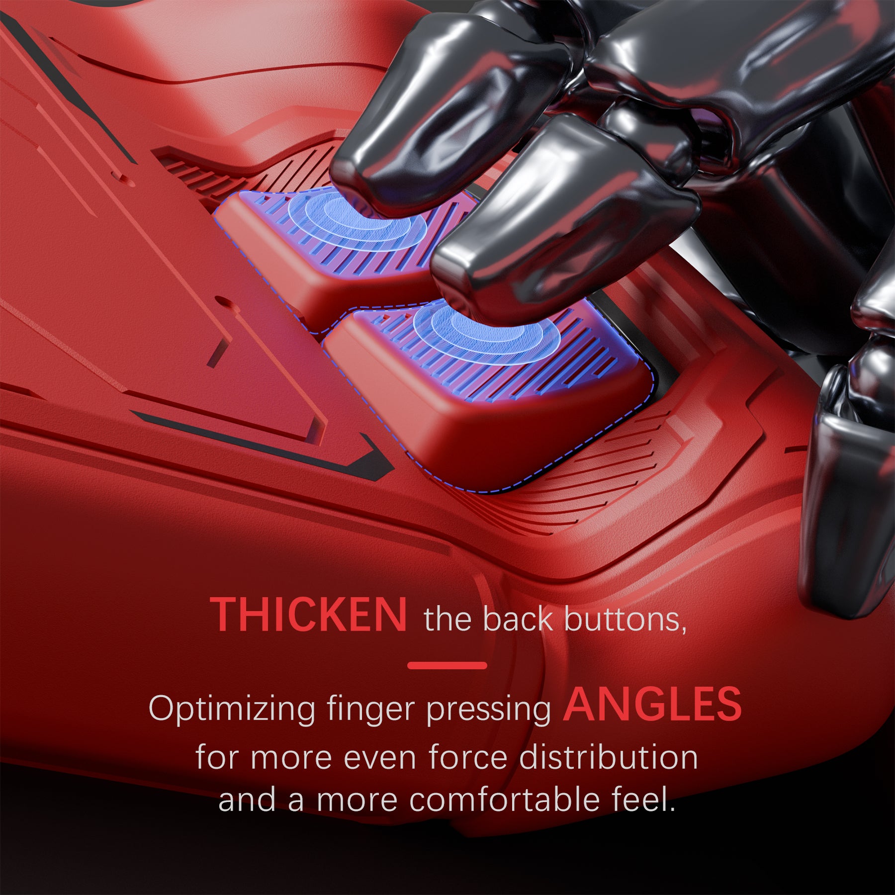 4. 完全なテーマセットには、シリコンカバー、メカ風スティックキャップ、ABXYボタン・方向キー・タッチパッド用ステッカー、さらに押し心地を強化し反応性を高める交換用バックボタンが付属。統一感のあるメカ風デザインでセットアップを完成させます。
