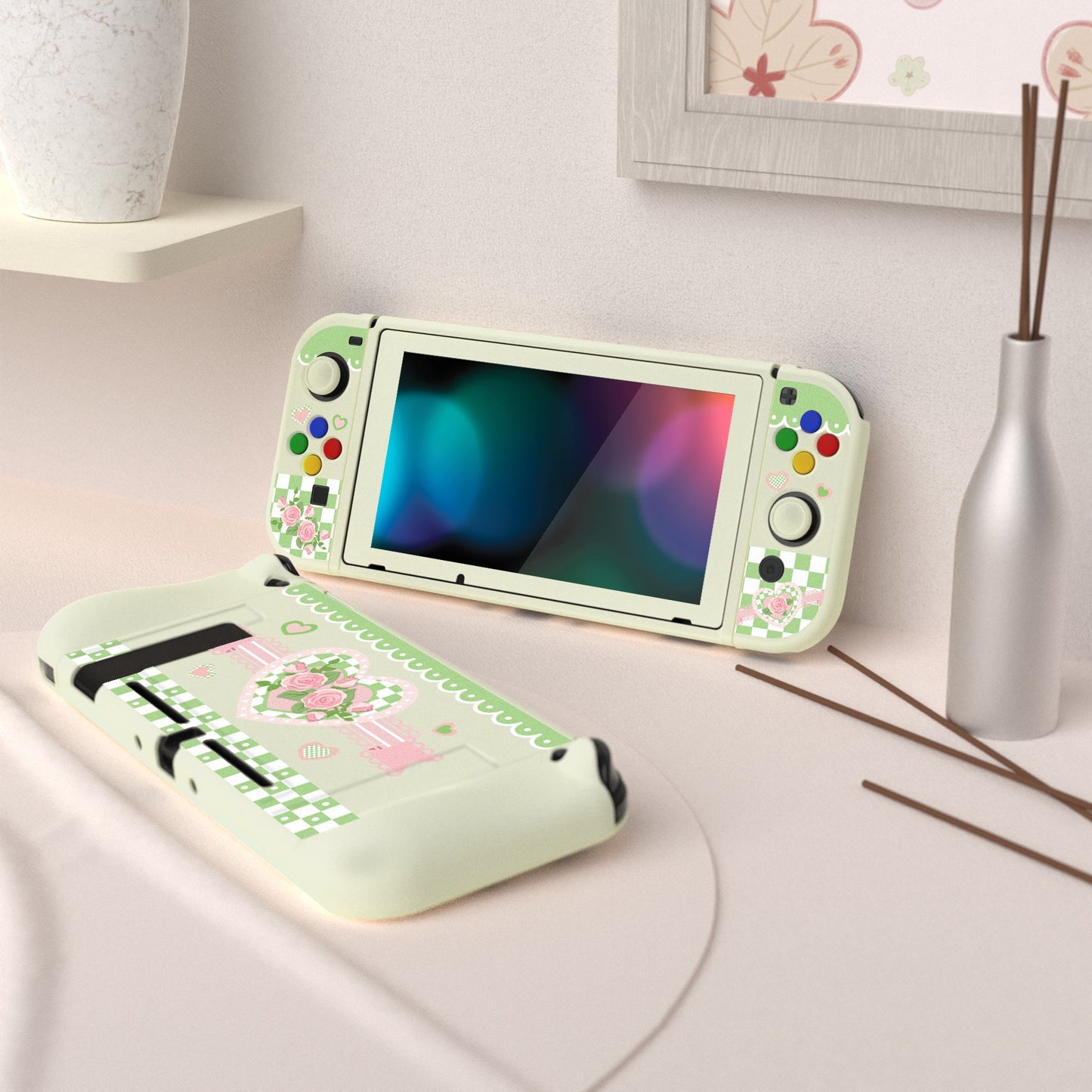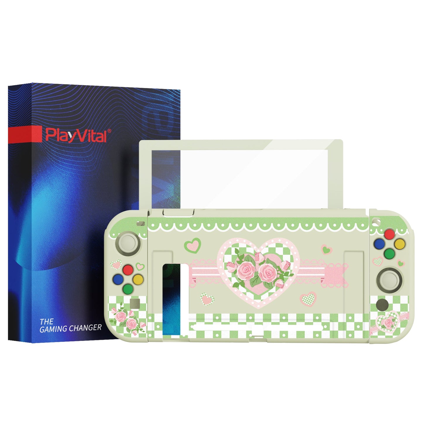 PlayVital ZealProtect ソフト TPU スリム保護ケース、強化ガラススクリーンプロテクター、サムグリップ、ABXY 方向ボタンキャップ付き NS Switch 用【シャビーシックローズ】