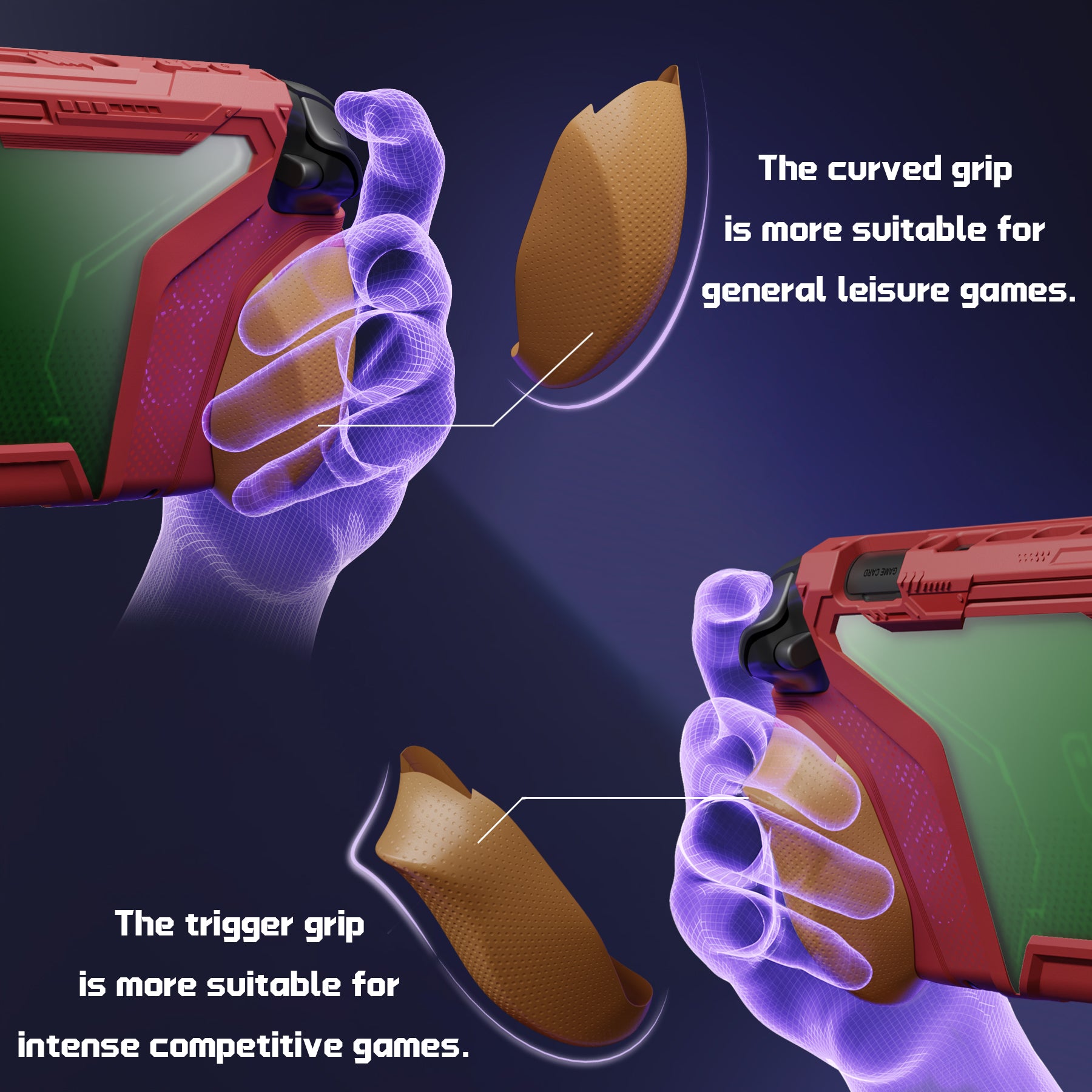 5. 交換可能な2種類のグリップが、自分好みの握り心地を提供。ユニバーサルグリップは安定性重視、エルゴノミックグリップはFPSゲームに最適。軽めの握り心地を好む方も、長時間プレイ向けのしっかりした握り心地を求める方も、スライドレール式で数秒で簡単に付け替え可能です。