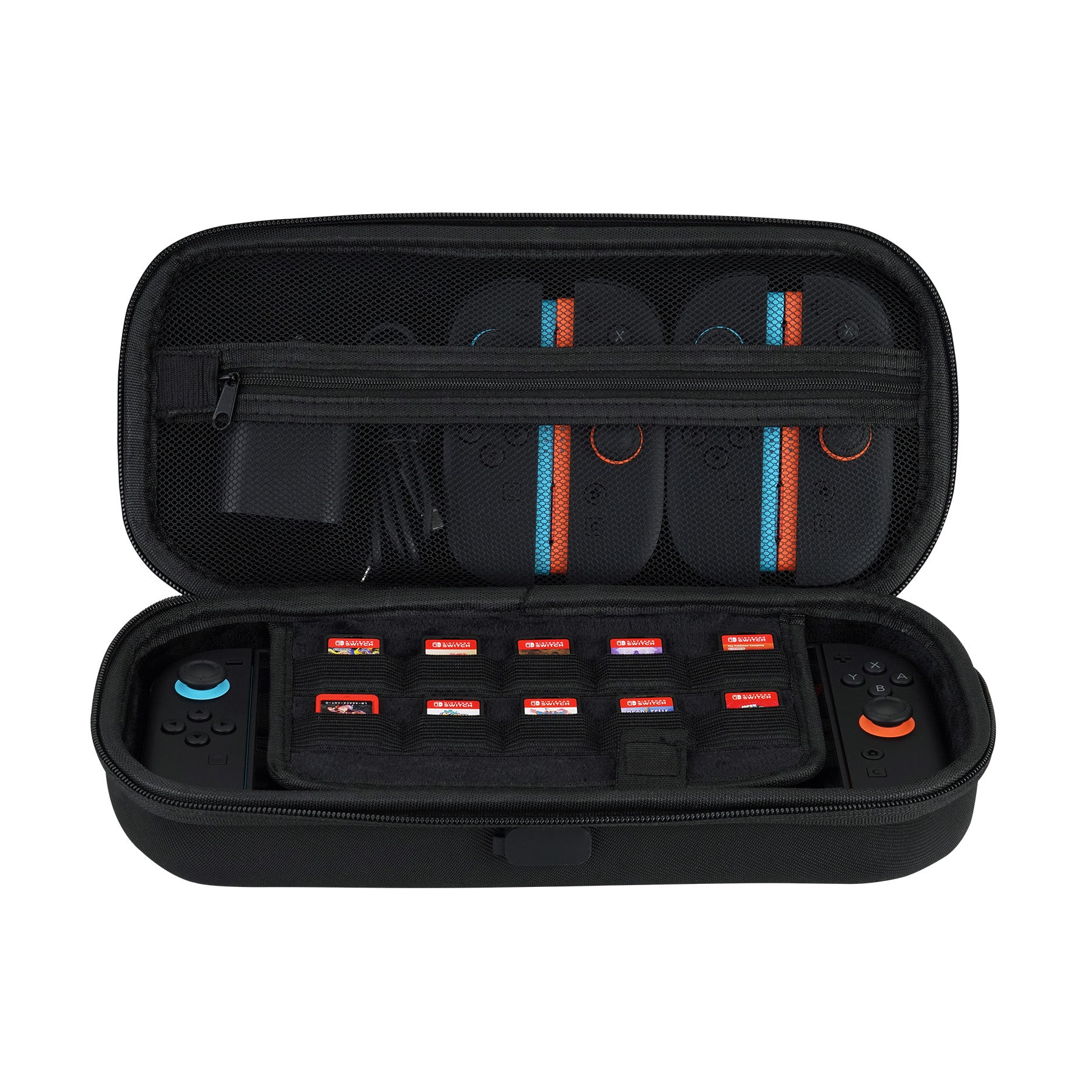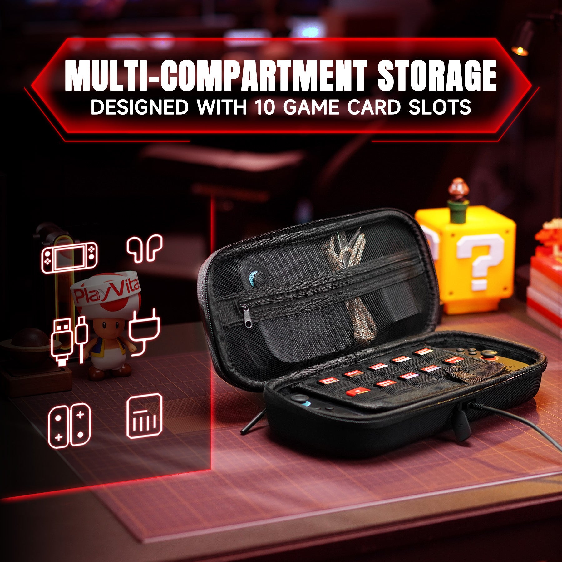 3. 内部は大容量設計で、Switch 2 本体、Joy-Con、充電器、イヤホン、ケーブルを収納可能。10枚のゲームカードスロット、ファスナー付きメッシュポケット、伸縮仕切り付きで整理整頓も簡単。飛行機内、通勤中、ゲームパーティーなど、必要なアイテムをひとつにまとめて安全に持ち運べます。