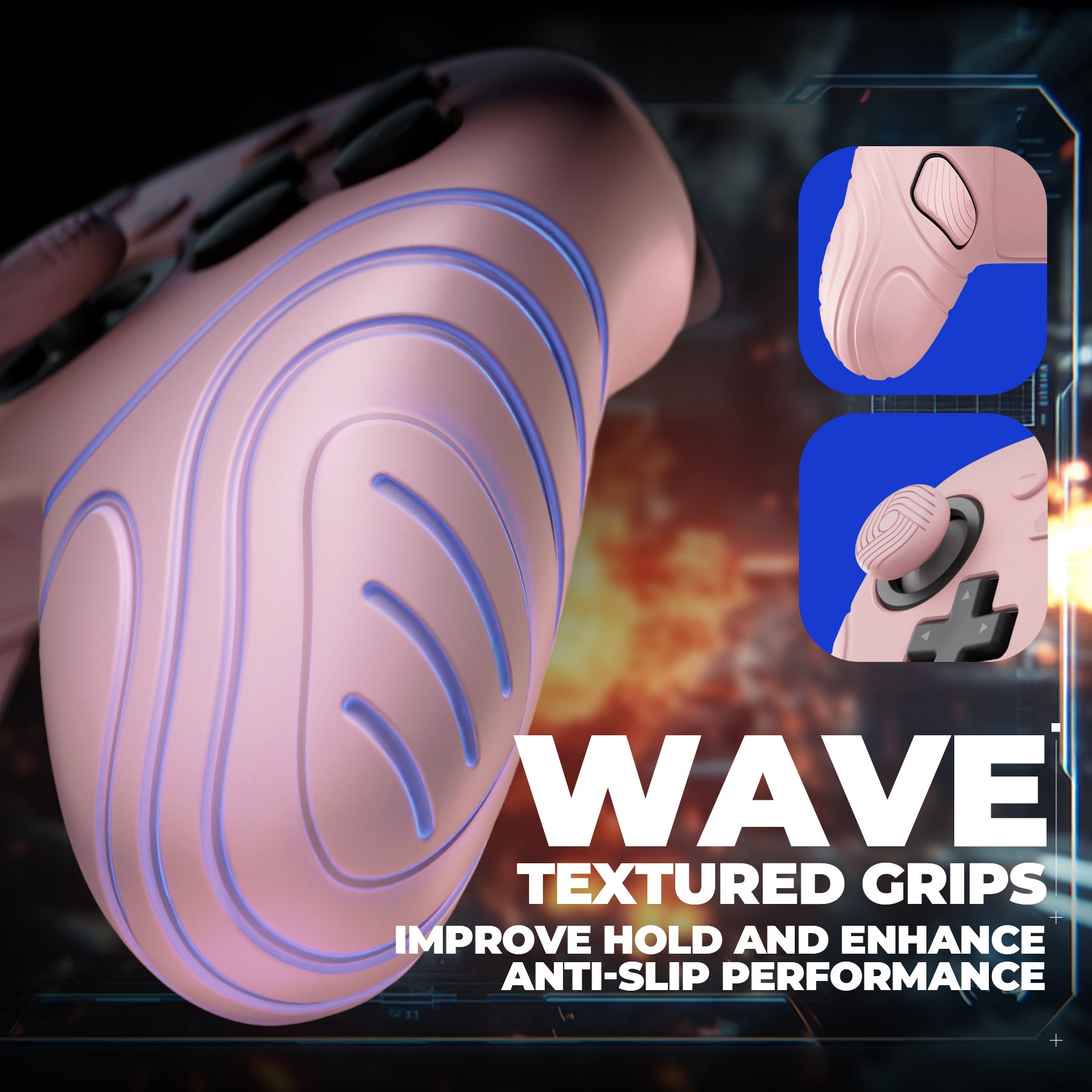 4. 接地面積が広がることで滑り止め効果が向上し、安定した操作感を提供。表面のテクスチャー加工により汗を分散し、動きの多いプレイや競技系ゲームでも手をドライに保ちます。