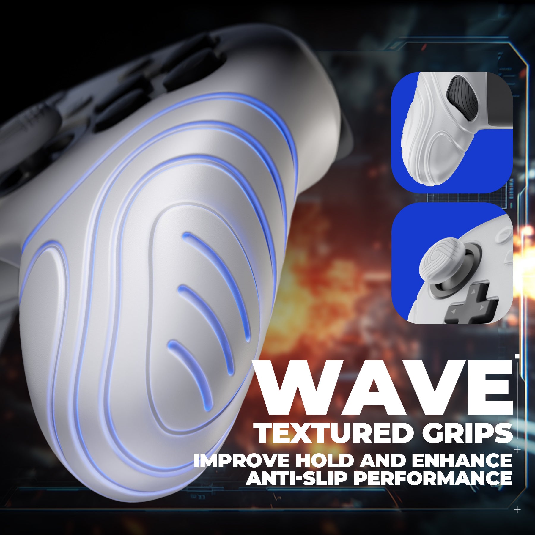 4. 接地面積が広がることで滑り止め効果が向上し、安定した操作感を提供。表面のテクスチャー加工により汗を分散し、動きの多いプレイや競技系ゲームでも手をドライに保ちます。