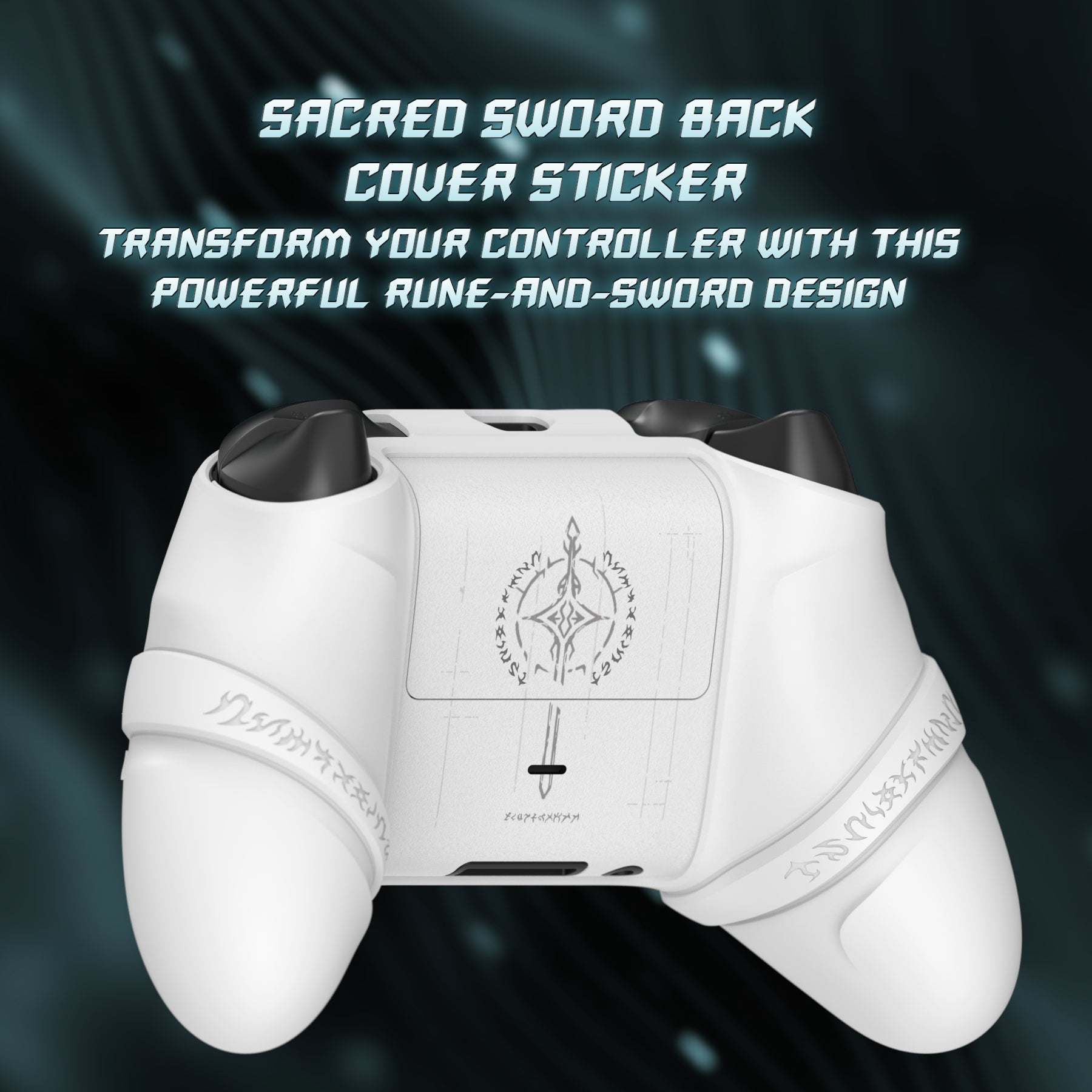 6. ルーンテーマのサムスティックキャップと、幻想的な世界観を演出する聖剣のバックプレートステッカーがセットになっており、統一感のあるカスタマイズが可能です。