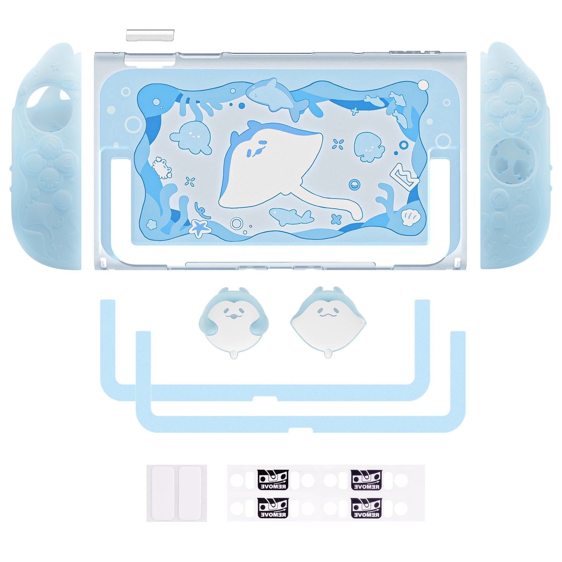 6. テーマに合わせたサムスティックキャップとキックスタンド用ステッカーが付属。やさしいグリップ感、しっかりした保護性能、そして爽やかなオーシャンデザインを兼ね備えた、Nintendo Switch 2 用の理想的なアクセサリーです。