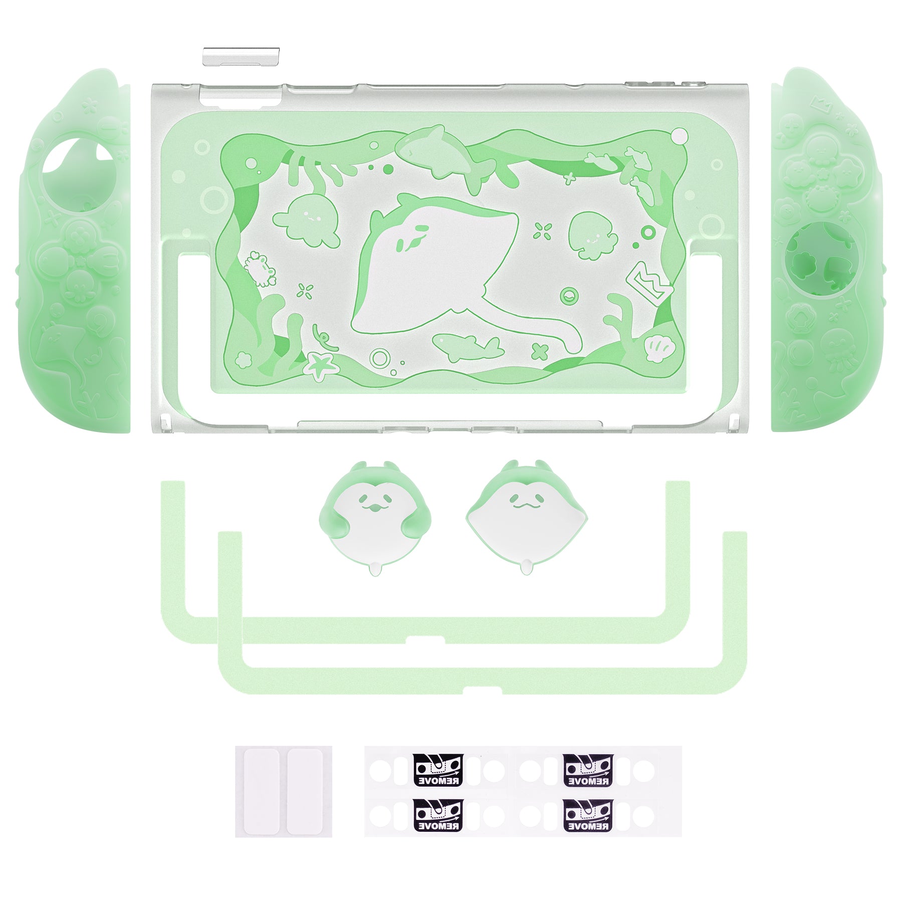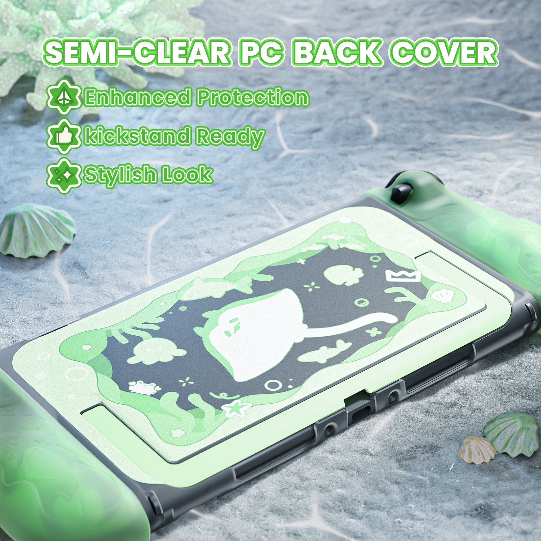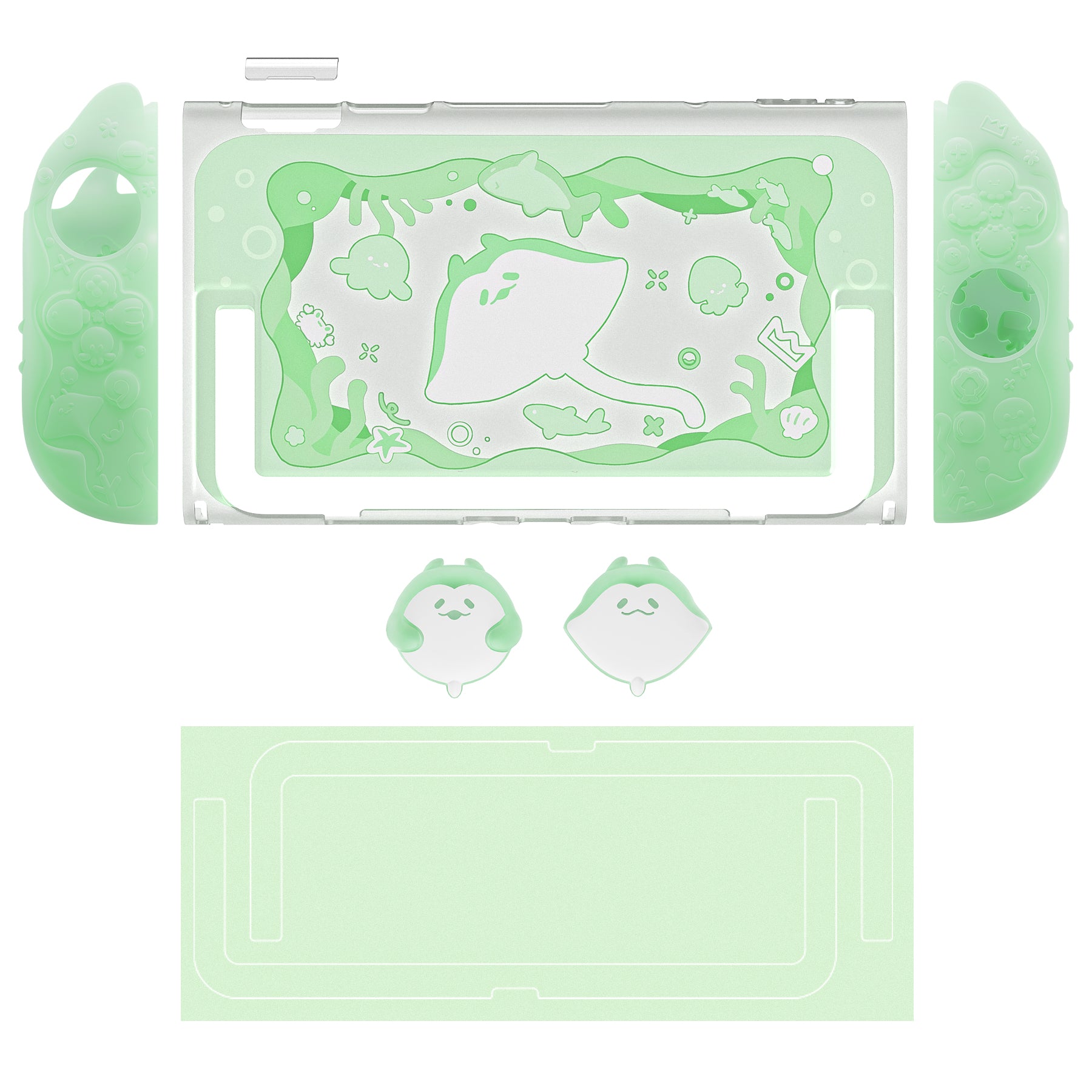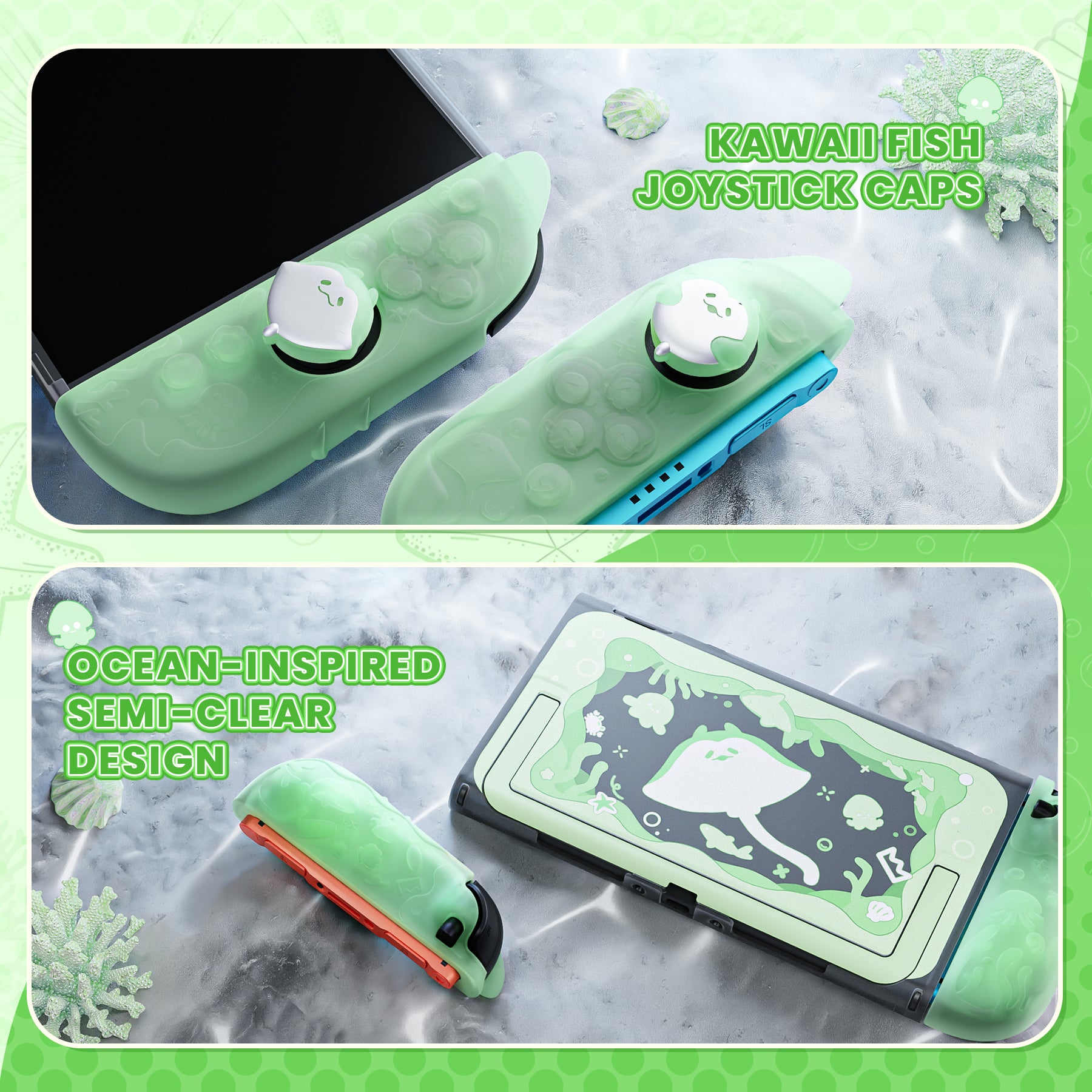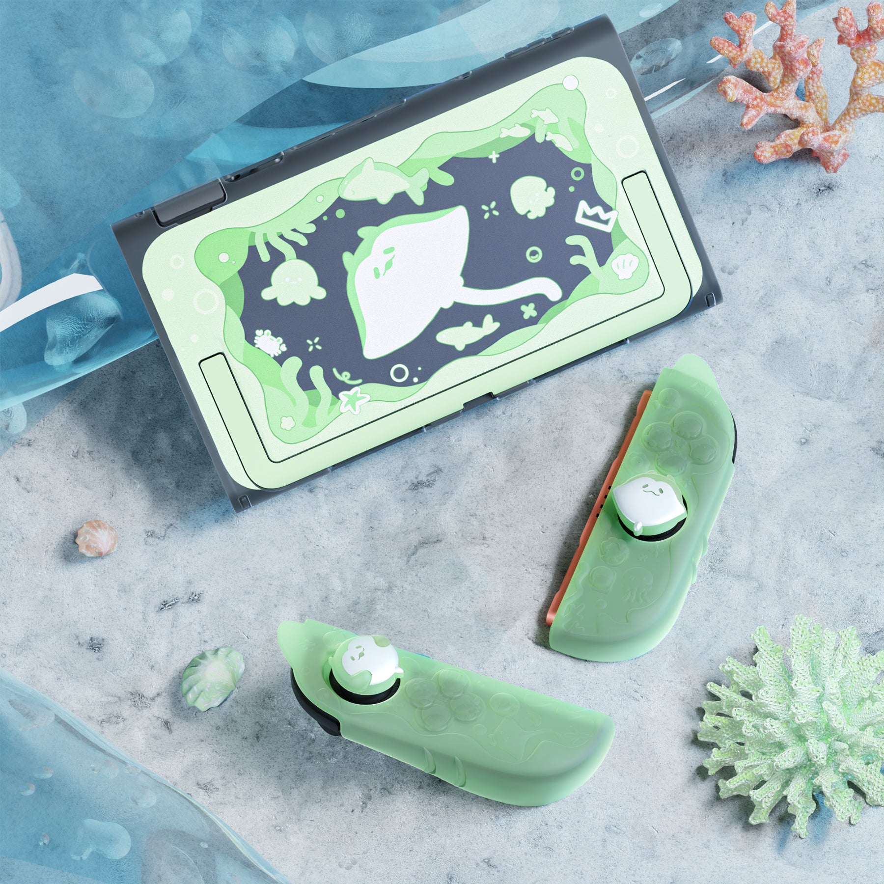 6. テーマに合わせたサムスティックキャップとキックスタンド用ステッカーが付属。やさしいグリップ感、しっかりした保護性能、そして爽やかなオーシャンデザインを兼ね備えた、Nintendo Switch 2 用の理想的なアクセサリーです。