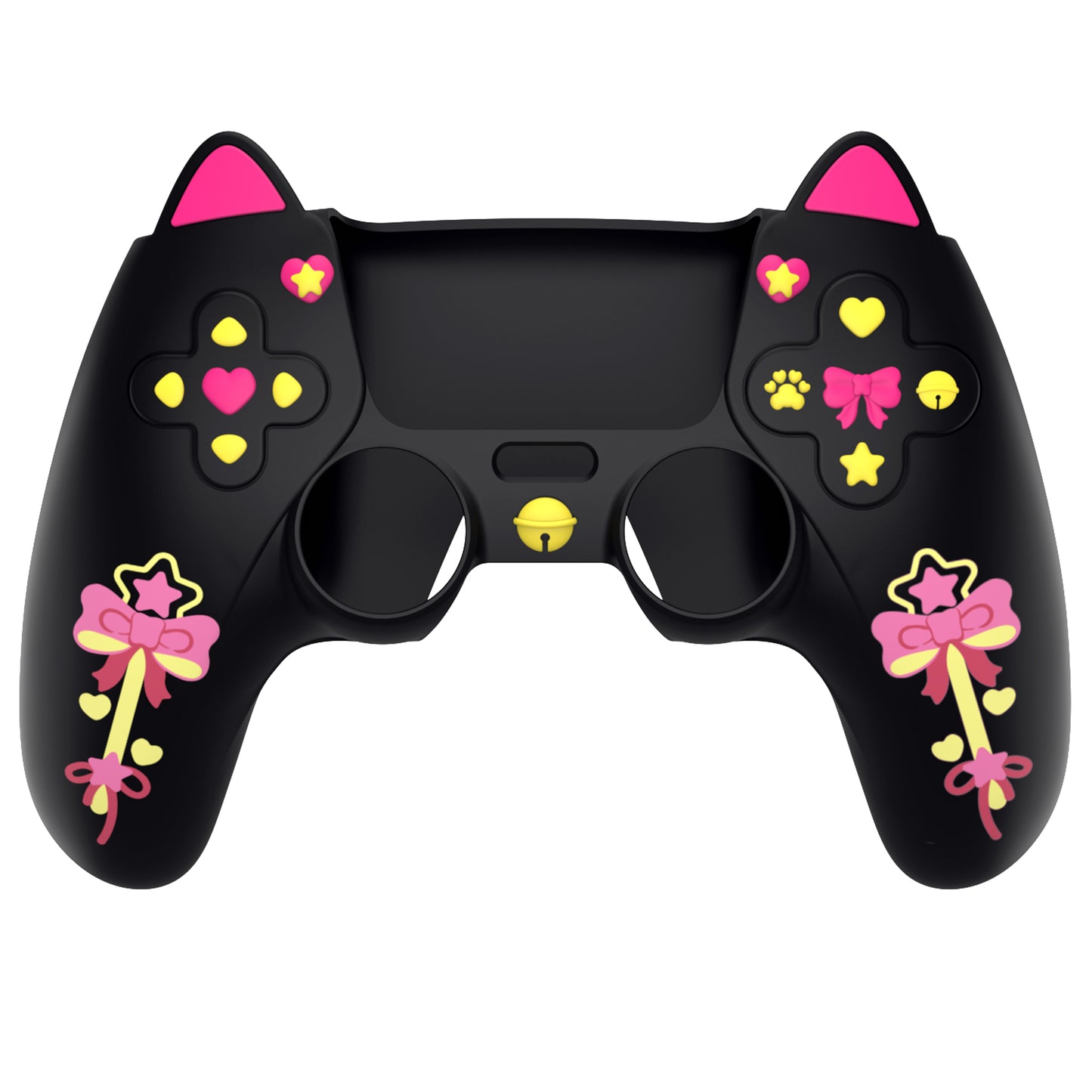 2. シリコンケースの上部には猫耳、両グリップには魔法の杖のパターン、キティテーマのタッチパッドステッカー、ベルロゴ、猫の足パッドジョイスティックキャップが特徴のこのピンクのシリコンカバーは、ゲームに遊び心を加えます。