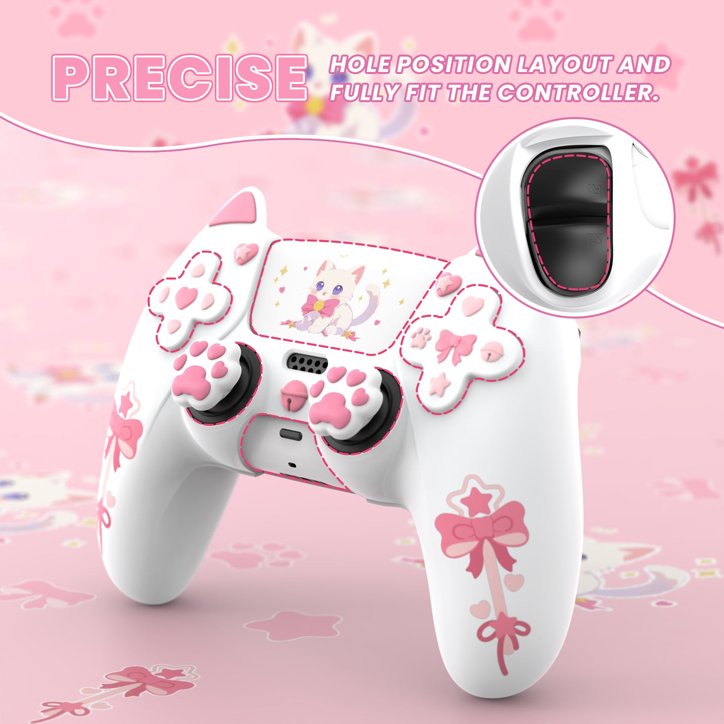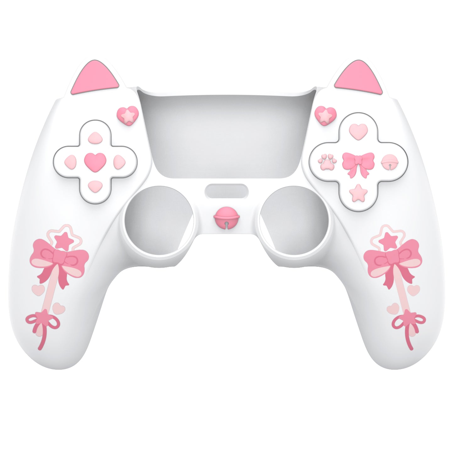 2. シリコンケースの上部には猫耳、両グリップには魔法の杖のパターン、キティテーマのタッチパッドステッカー、ベルロゴ、猫の足パッドジョイスティックキャップが特徴のこのピンクのシリコンカバーは、ゲームに遊び心を加えます。