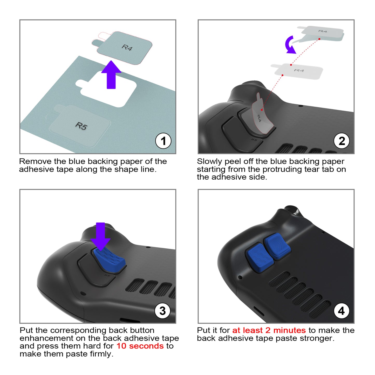 1. バックボタン強化パッドの外観の違いにご注意ください。R4 L4とR5 L5の形状は同じではありません。各パーツは対応するボタンにしか取り付けることができませんので、違いに注意して取り付けてください。